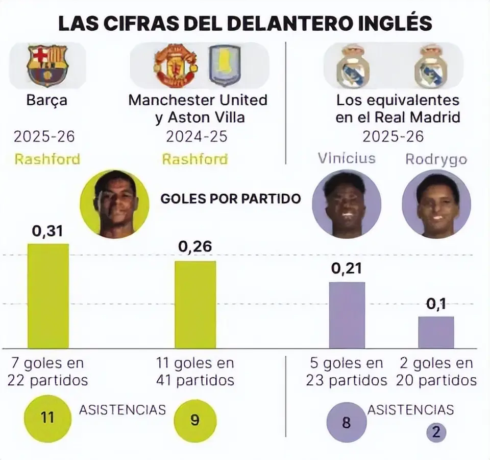 在国王杯打入一球之后,拉什福德本赛季在巴萨的各项赛事数据已经来到7球11次助攻上上策,与此同时皇马的巴西双子星韦尼休斯和罗德里戈的数据之和是7球10助攻。