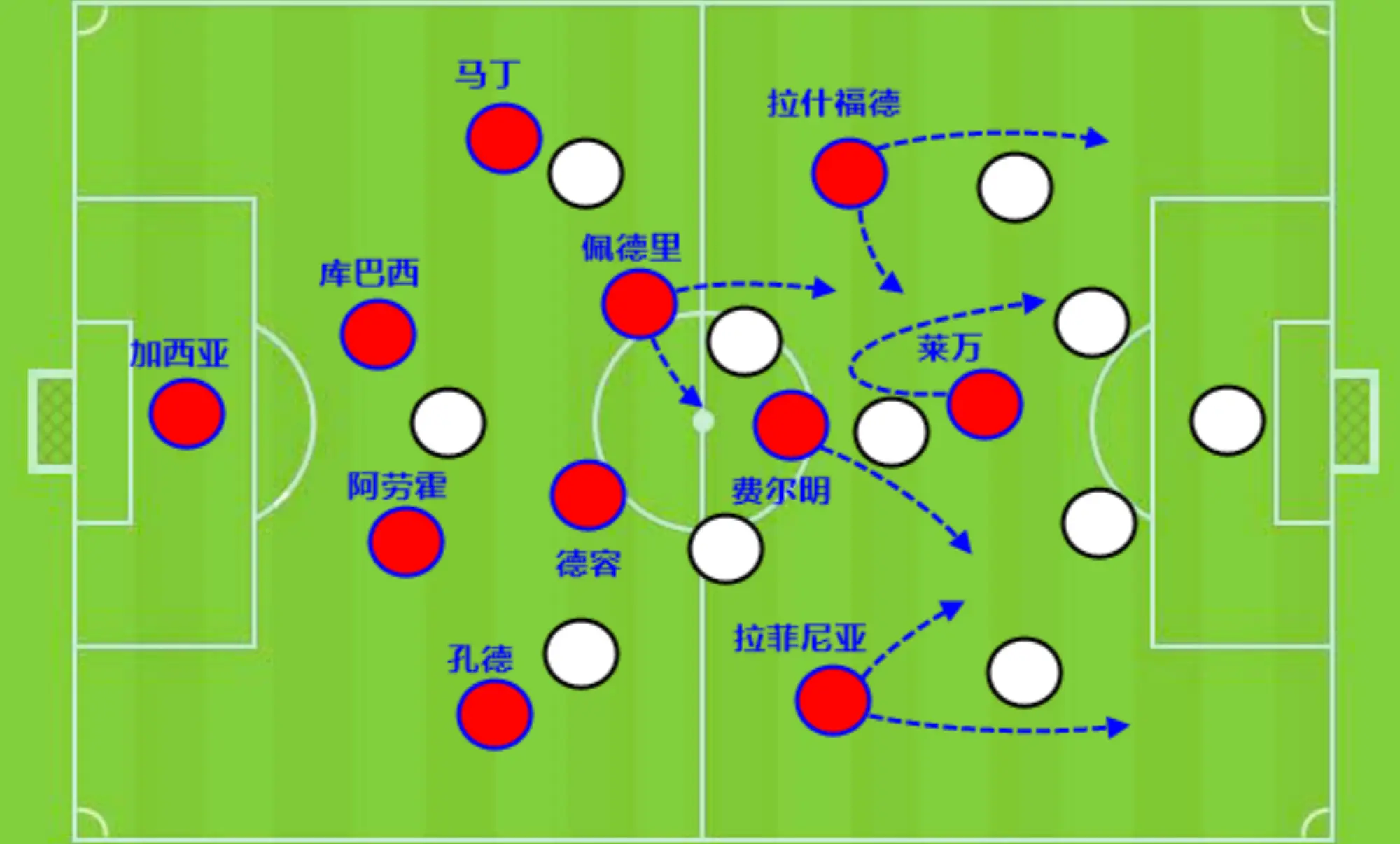 拉什福德发挥最好的一个阶段,也是佩德里先发,同时另外一侧使用拉菲尼亚,中路用莱万。