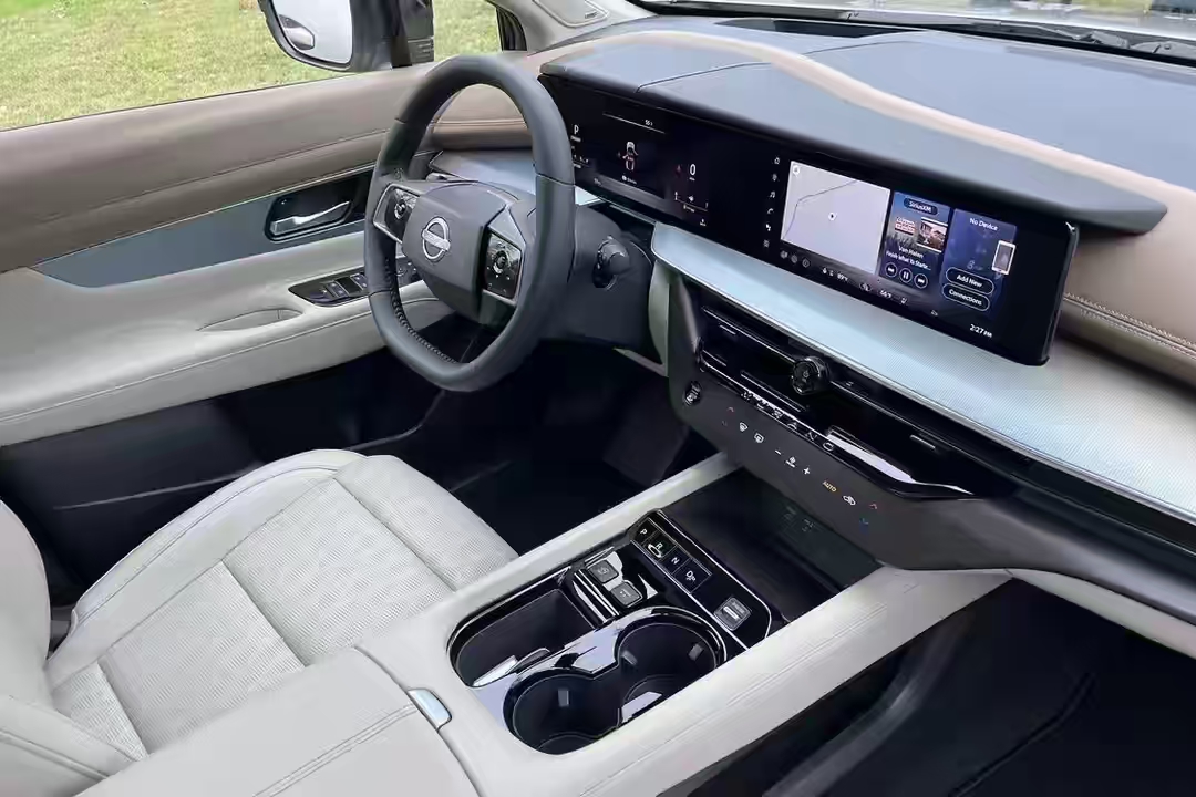 内饰方面,全新日产楼兰的设计可以说顺应了当下潮流,特别是悬浮式双联屏的设计,呈现出了极强的科技感,两块屏幕均达到了2K分辨率,并搭载最新的Nissan Connect超智联系统,而为了提升实用性,屏幕上方还特别加入了防反光盖板,值得注意的是,换挡机构变成了小巧的按键式设计,方向盘换装了新颖的两辐设计,看上去时尚且个性。