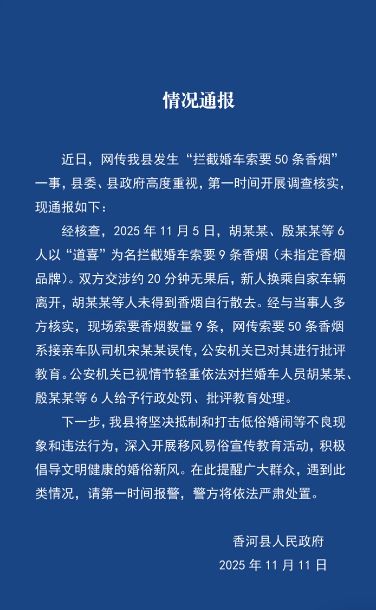 11月5日上午,河北一对新人的婚车遭遇拦截,拦车者索要50条香烟作为喜钱。今天(11月11日),河北廊坊香河县发布通报:50条系误传,已对拦婚车6人行政处罚、批评教育。通报如下: